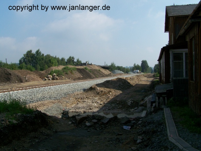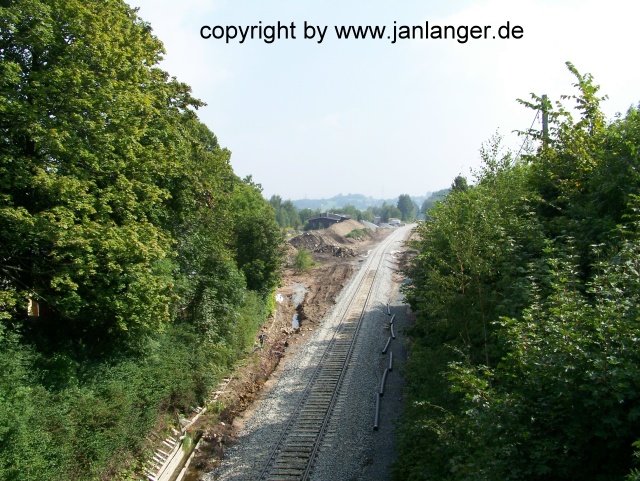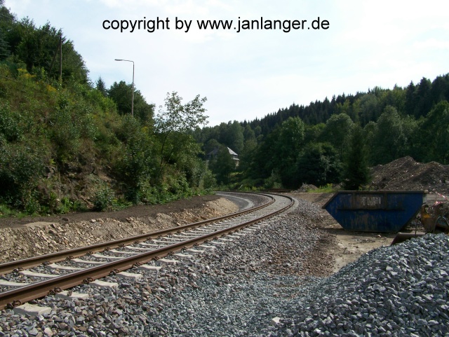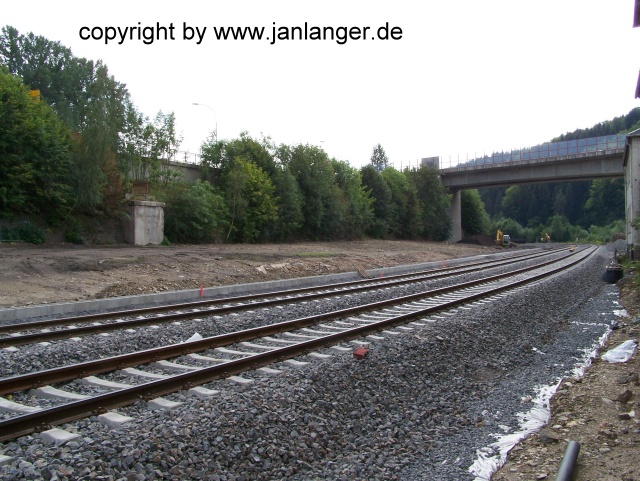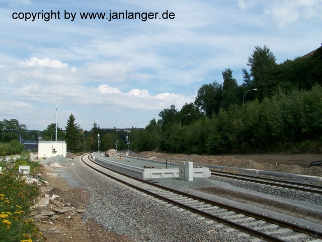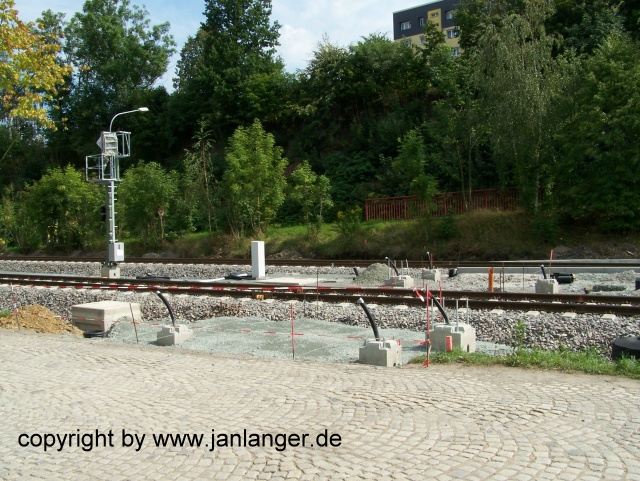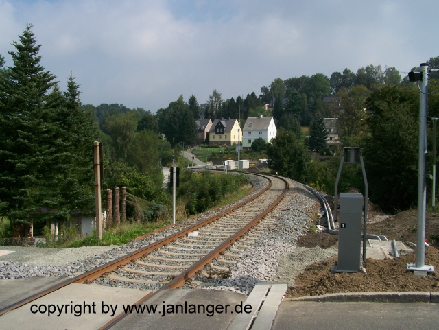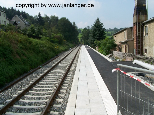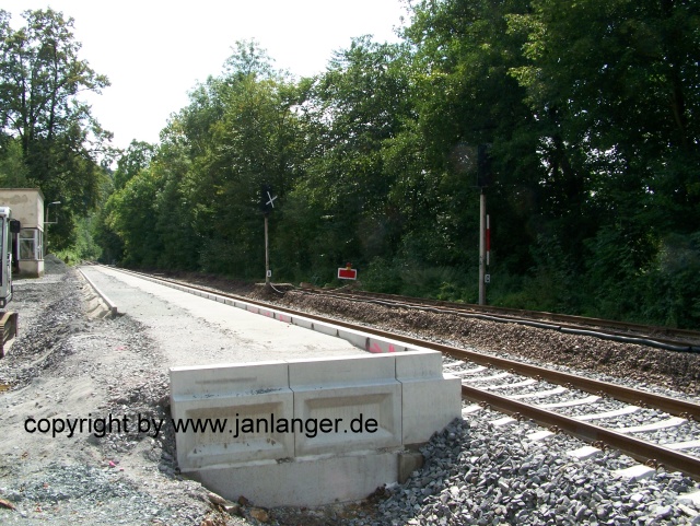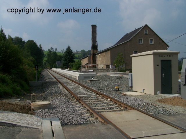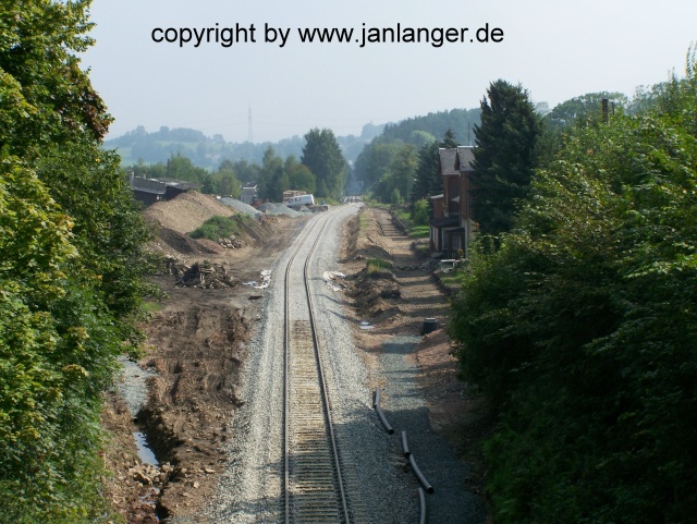 Der Umbau ist im vollen Gange. Neues ist entstanden. Altes verschwunden. Gefahren wird bis Erdmannsdorf-Augustusburg auf der Schiene. Weiter bis Annaberg-Buchholz unterer Bahnhof nur mit Schienenersatzverkehr. Anfangs war sogar ein Bus der BVO-Erzgebirge GmbH zu sehen. Mittlerweile fährt nur noch ein Transporter in deren Auftrag. Dieser aber regelmäßig im 2-Stunden-Takt. Teil 2: Neuer Haltepunkt Flöha-Plaue In Flöha-Plaue entsteht ein neuer Haltepunkt. Blick Richtung Süden. Eine etwas nähere Aufnahme. Ebenfalls wird der Bahnübergang auf den neuesten Stand der Technik gebracht. Bahnhof Erdmannsdorf-Augustusburg Leider wird er zu einem Haltepunkt zurückgebaut. Die Ausfahrt Nord. Ein Blick in Richtung Süden. Der alten Hausbahnsteig wird komplett erneuert. Zukünftig soll in Hennersdorf gekreuzt werden. Neuer Haltepunkt Zschopau-Ost Der Bahnsteig ist bereits fertig. Auch hier wird der Bahnübergang komplett erneuert. Bahnhof Zschopau Die Gleisanlagen des Bahnhofes in Zschopau wurden vollständig entfernt und neu aufgebaut. Nichts erinnert mehr an den alten Bahnhof. Links im Bild der graue Betonblock mit rotem Geländer ist der Rest einer Brücke über die Gleisanlagen. Ich habe von dieser seinerzeit die letzten Bilder gemacht. Der neue Bahnsteig ist jetzt etwas näher an den Ortskern gerückt. Hoffentlich bekommt er auch ein Dach. Die neue Ausfahrt Ost. Ein Blick zurück. Hier entsteht der neue Zugang zum Bahnsteig. Nochmals ein Blick aus Osten in Richtung Südwesten. Bahnhof Wilischthal Der neuer Zugang und zugleich Unterführung. Die Ausfahrt in Richtung Süden. Auch hier ist nicht viel übrig geblieben vom Bahnhof. Nur noch ein einsamer Bahnsteig. Bahnhof Wolkenstein Ein Blick auf die neuen Gleisanlagen in Wolkenstein. Etwas herangeholt. Der alte Bahnsteig ist nicht mehr vorhanden und mußte einem Neubau weichen. Von einem neuen Bahnsteigtunnel habe ich noch nichts gesehen. Ich hatte aber auch nur einen begrenzten Zugang. Neuer Haltepunkt Wiesa Der Bahnsteig ist schon fertiggestellt. Er liegt jetzt deutlich näher am Ortskern. Ein genauerer Blick. Die Ausfahrt in Richtung Wiesenbad. Auch hier wird der Bahnübergang erneuert. Bahnhof Schönfeld-Wiesa Vom ehemaligen Bahnhof ist nichts mehr geblieben. Ein einzelnes Gleis geht noch durch ihn. An der rechten Bildseite ist das ehemalige Empfangsgebäude zu sehen. Nur noch große Dreckhaufen, die hoffentlich bis Dezember verschwinden. Zurück ging es mit dem Auto. Damit endet der zweite Teil meiner Dokumentation. |